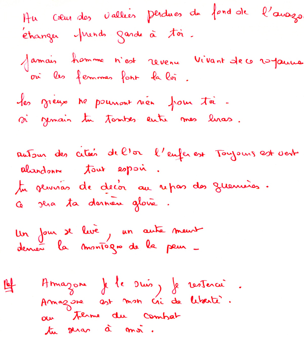 Gilles De Loonois, qui a écrit de très jolis textes pour Rose, transporte ici la chanteuse dans la tribu des guerrières Amazones. En résulte une chanson pop-rock à la rythmique entraînante et à la thématique évidemment féministe : « Jamais homme n’est revenu vivant de ce royaume où les femmes font la loi », « esclave ou partenaire, tu n’as pas le choix ». Au vu du nombre de versions réalisées de cette chanson, tout laisse à penser que son potentiel évident avait été repéré par Rose et son équipe, mais Amazone, qu’on aurait bien vu en face A d’un 45 tours, restera pourtant inexploitée. Comme à son habitude, son auteur, très impliqué, ira jusqu’à modifier son texte afin qu’il sonne le mieux possible dans la bouche de la chanteuse.
