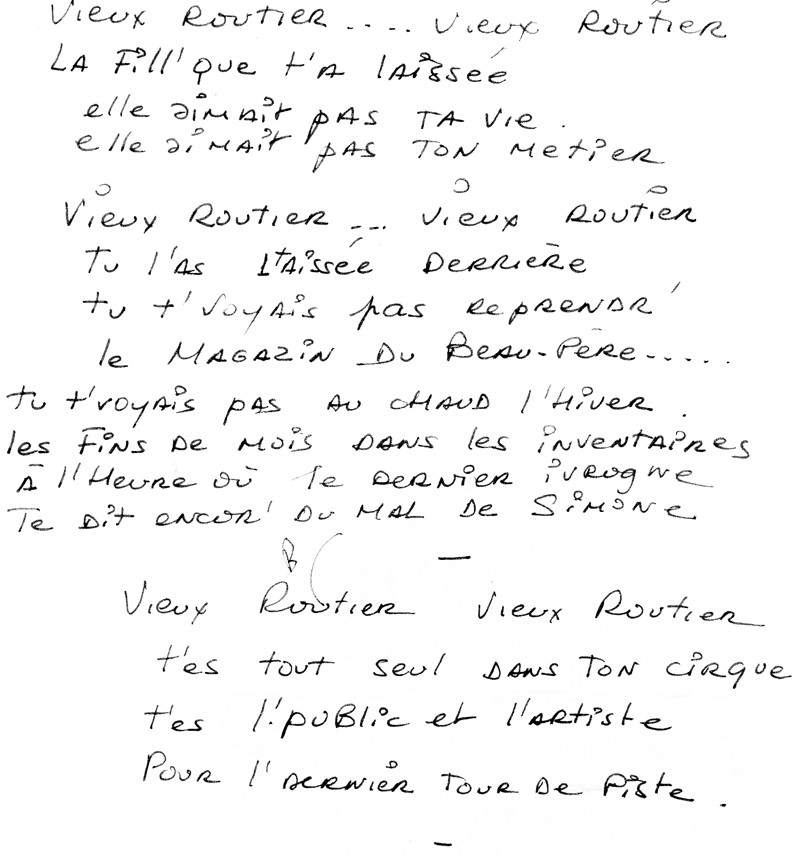 Juste avant de signer chez Warner, Rose Laurens enregistrait dans le home studio de Jean-Pierre Goussaud et c’est à cette époque qu’ils travaillent ensemble avec le parolier Boris Bergman dont elle admire la plume. Si nous avons pu découvrir le superbe L’Homme sur Chaleur humaine, voici Vieux routier, un titre surprenant aux accents country-folk qui siéent étonnamment bien à la chanteuse qui s’y révèle très à l’aise. Comme bien souvent, Bergman nous embarque dans son univers et nous raconte une histoire, ici celle de ce camionneur désenchanté au destin atypique qui s’est « pris dans les fils d’un billard d’araignée ». À la même époque, Bergman signe un autre texte sur-mesure pour Rose (Le Messager) avant de la retrouver près de trente ans plus tard pour travailler ensemble à nouveau. Il existe une autre version de Vieux routier (avec de la reverb sur la voix).