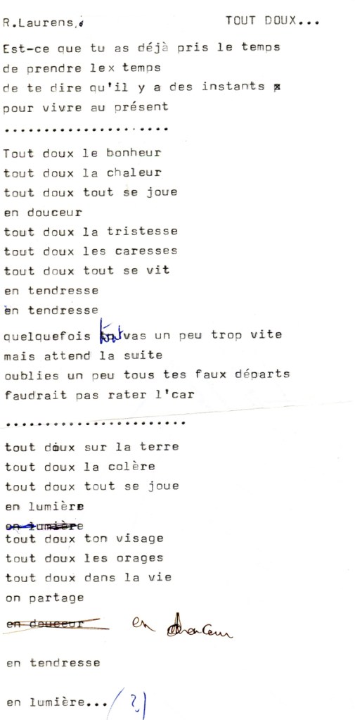 Superbe ballade mélancolique au texte de Claude Lemesle, Où va le temps est l’un des premiers titres composés pour Rose par Jean-Pierre Goussaud peu de temps après leur rencontre. « Où vont nos rires d’enfants sitôt que l’on quitte la ronde ? » Quelques années avant de se demander « Où vont tous ceux qu’on aime », c’est la nostalgie du temps qui passe qui est évoquée ici, un thème qui sera repris par Claude Lemesle pour une chanson de Nana Mouskouri comme nous le confiera l’auteur. Rose Laurens met dans son interprétation d’Où va le temps toute sa puissance vocale et fait de cette chanson l’un des temps forts de cet album.