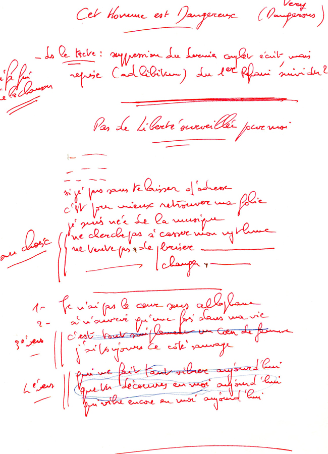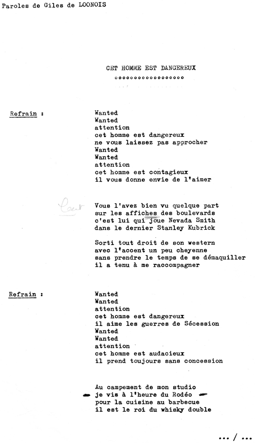 C’est un cowboy tout droit sorti d’un western dont il faut se méfier ici. Cet homme est dangereux car il est irrésistible et a visiblement pour habitude d’obtenir tout ce qu’il veut, notamment les faveurs des dames… On vous laisse découvrir le texte de Gilles de Loonois, qui est, à ce sujet-là, assez évocateur. Chanson de 1978, dans la même veine que Pas de liberté surveillée et Vieux routier (Où va le temps) enregistrées à la même période, avec un petit côté rhythm and blues qui va si bien à la chanteuse. On note que toute une partie du texte original a été supprimée (voir ci-dessous).