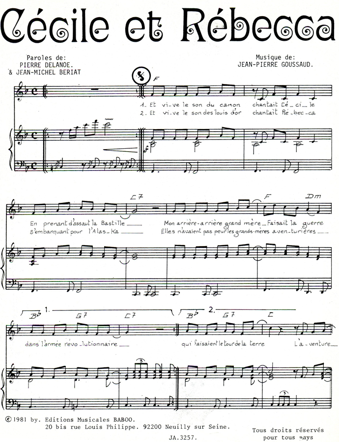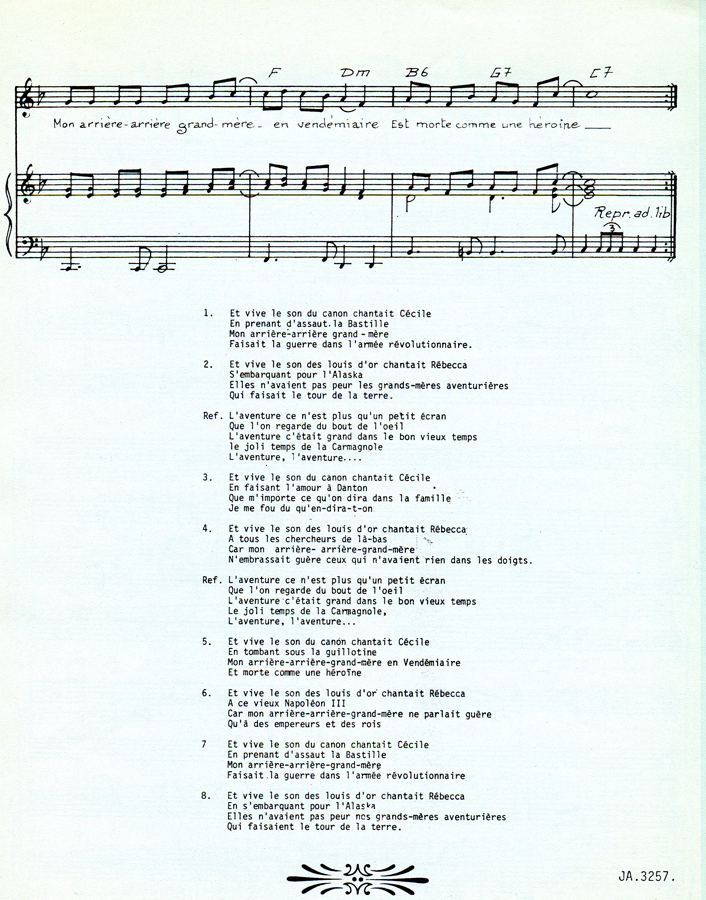 Chanson écrite par Pierre Delanoë et Jean-Michel Bériat sur une musique de Jean-Pierre Goussaud, L’Aventure était destinée au groupe La bande à Basile qui en fait un 45 tours chez Vogue en 1981 sous le titre Cécile et Rebecca (L’Aventure). Mais avant cela, c’est Rose Laurens qui en enregistre la maquette ! L’Aventure est un hymne féministe en hommage au courage des femmes de la Révolution française (en comparaison à l’aventure d’aujourd’hui qui se résume à jeter un œil sur nos écrans de télévision). Un titre enjoué qui aurait eu sa place dans une comédie musicale, mais qui ne connaîtra pas le succès.