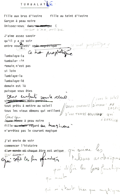 De parenté musicale avec Djaganero, un autre inédit découvert sur l’album Chaleur humaine en 2022, Tumbapalea nous propose un thème très différent puisqu’il est question ici d’un couple vraisemblablement africain. Deux êtres unis par la musique et un mystérieux « mot prophétique », mais on se doute qu’ici l’amour n’est pas chose aisée car le « temps nouveau qui s’éveille » doit faire face à des « fous fanatiques ». Ce titre entêtant et rythmé nous rappelle d’autres évocations africaines qu’on retrouve dans le répertoire de la chanteuse : Africa bien entendu, mais aussi La Négresse blanche ou encore Musique métisse (un titre encore inédit).