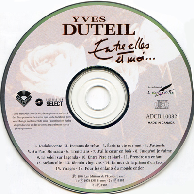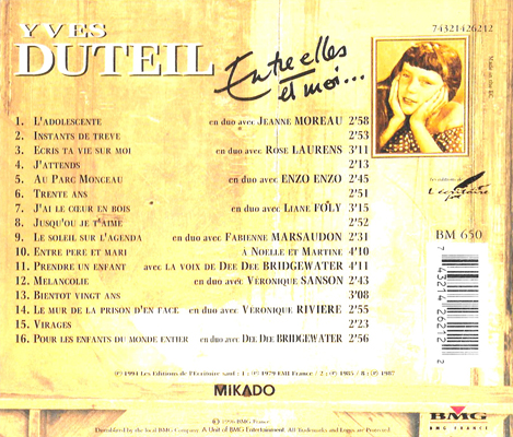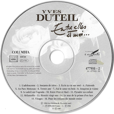 En 1994, Yves Duteil reprend certaines de ses chansons sur l’album Entre elles et moi… avec la complicité de ses voix féminines préférées. Véronique Sanson, Jeanne Moreau, Liane Foly, Dee Dee Bridgewater, Véronique Rivière, Fabienne Marsaudon sont de la partie, mais aussi Rose Laurens ! Ensemble, ils enregistrent Écris ta vie sur moi, magnifique composition de Jean-Pierre Goussaud dont Duteil avait signé le texte pour l’album de Rose en 1986. « Une Rose épanouie mais tremblante d’émotion qui nous a tous laissés le souffle coupé après la toute première prise » écrit Yves Duteil dans le livret de l’album. Le disque sortira en CD et cassette en France et au Canada où Duteil est très populaire, ainsi qu’en coffret promo CD pour la France.