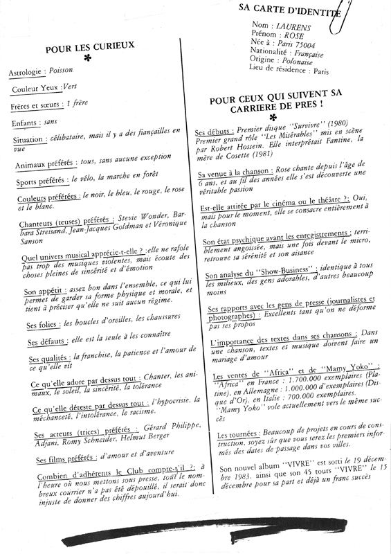 Heureusement, l’année 1984 ne sera pas que frustration, et Rose reçoit fin janvier au Midem de Cannes des mains de Patrick Sabatier et Diane Tell le trophée de l’artiste féminine de l’année 1983. Janvier est également l’occasion d’adresser à ses admirateurs le deuxième bulletin de son fan club qui récapitule son actualité, offre un portrait de la chanteuse sous forme de questions-réponses, ainsi que les paroles du dernier single, Vivre.