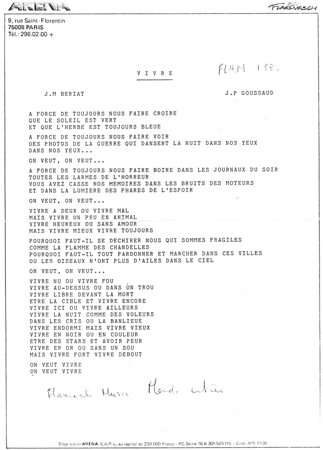 Quant à la chanson qui donne son titre à l’album et qui va permettre à Rose d’en assurer la promotion, elle la commente en ces termes : « Vivre correspond à ce que je voulais dire de façon urgente, à savoir ma rage de vivre ». Là aussi une chanson plus sérieuse, un état des lieux très sombre de la société contemporaine, mais aussi un chant d’espoir et de lutte dans lequel les êtres humains font preuve d’une grande résilience en affirmant leur désir de vivre coûte que coûte. Il s’agit cette fois d’une ballade plutôt qu’un titre dansant comme l’aurait souhaité la maison de disques. Après s’être montrés conciliants en enregistrant Mamy Yoko, Rose et Jean-Pierre imposent cette fois-ci une autre facette de Rose Laurens.